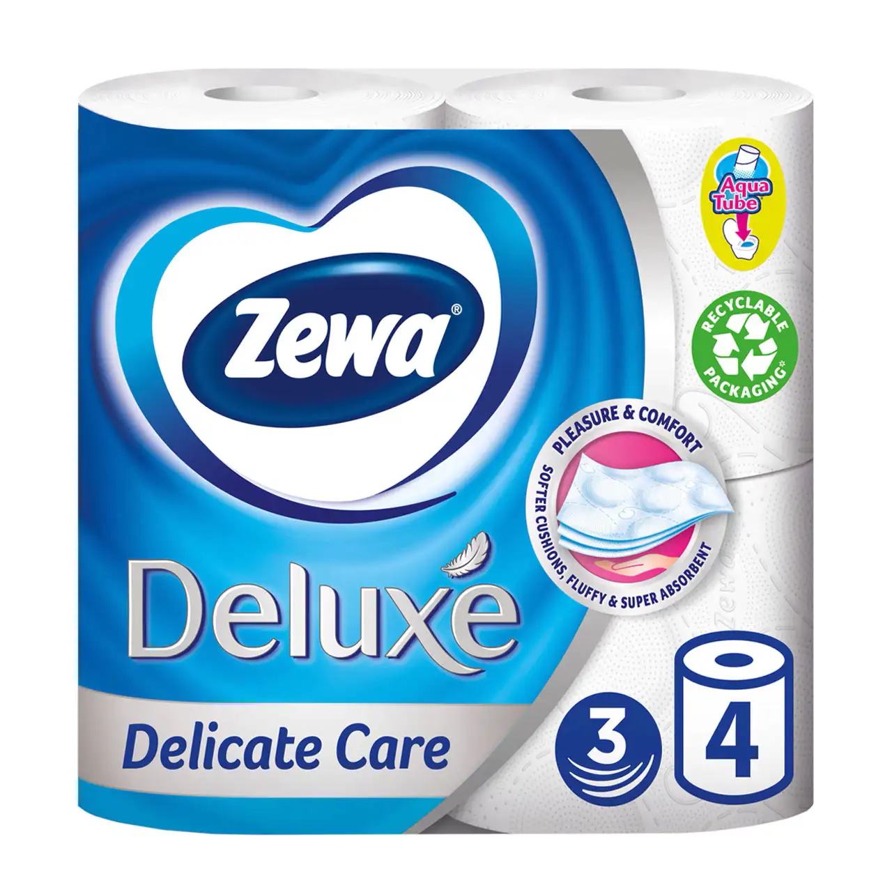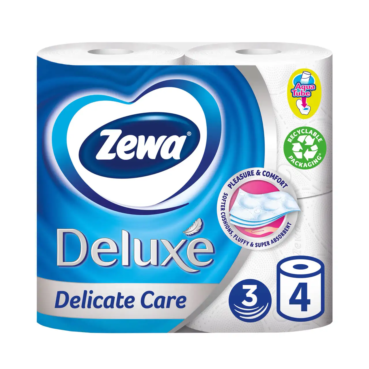 Hartia igienica Zewa Deluxe Delicate Care ce are 3 straturi si este impachetata 4 role per pachet este o hartie igienica de culoare alba cu parfum placut de prospetime. Acest model de hartie igienica Zewa este cu rola compacta si suficient de groasa ce vine in fasii de 3 straturi super absorbante, oferind in egala masura rezistenta si delicatete. Hartia igienica este 100% biodegradabila, infasurata pe tub realizat din aceeasi hartie (100% biodegradabila) care se poate dizolva direct in vasul toaletei. In timpul depozitarii, hartia zewa deluxe delicate trebuie ferita de locuri umede.